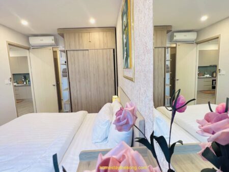 Nội thất trong căn hộ được trang bị đầy đủ và cao cấp, không thiếu điều gì để đáp ứng nhu cầu của quý khách. Có một sofa bed thoải mái để nghỉ ngơi, và căn hộ được bố trí ở tầng cao, mang đến cho quý khách một tầm nhìn đẹp về nội khu dự án. Khu vực xung quanh căn hộ rất yên tĩnh, giúp quý khách có thể thư giãn và tận hưởng khoảnh khắc riêng tư.