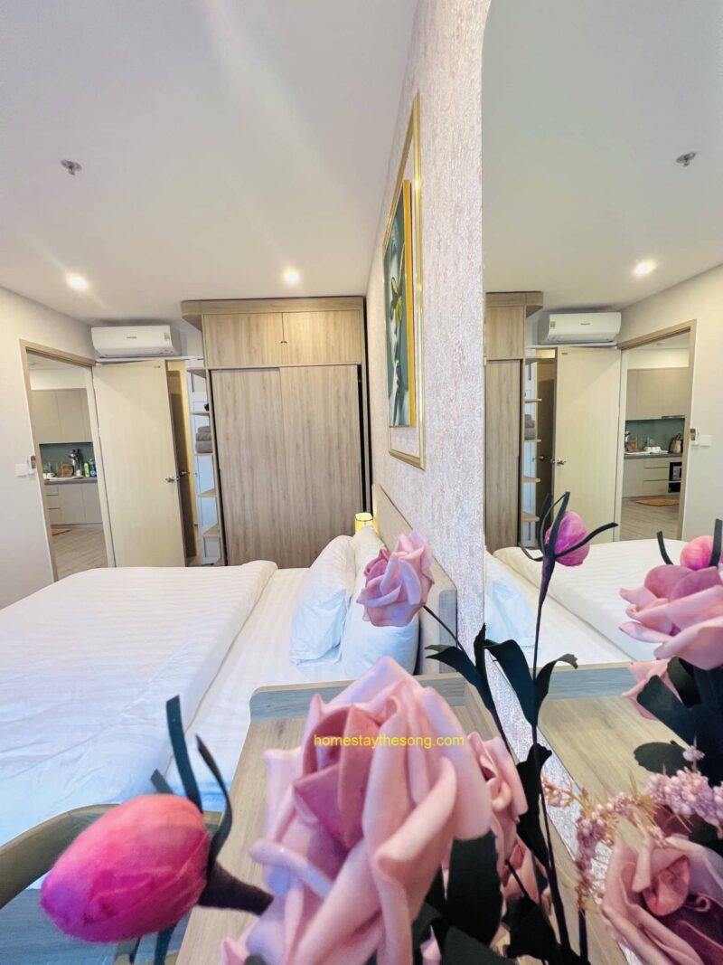 Căn hộ 27.25 của Homestay The Sóng là một không gian dễ thương và đáng yêu, sẽ mang đến cho quý khách trải nghiệm lưu trú ấm cúng và thoải mái. Với diện tích rộng lớn lên đến 72m2, căn hộ này có 2 phòng ngủ lớn và 1 phòng ngủ nhỏ, tạo điều kiện thuận lợi cho gia đình hoặc nhóm bạn có từ 6 đến 9 người.