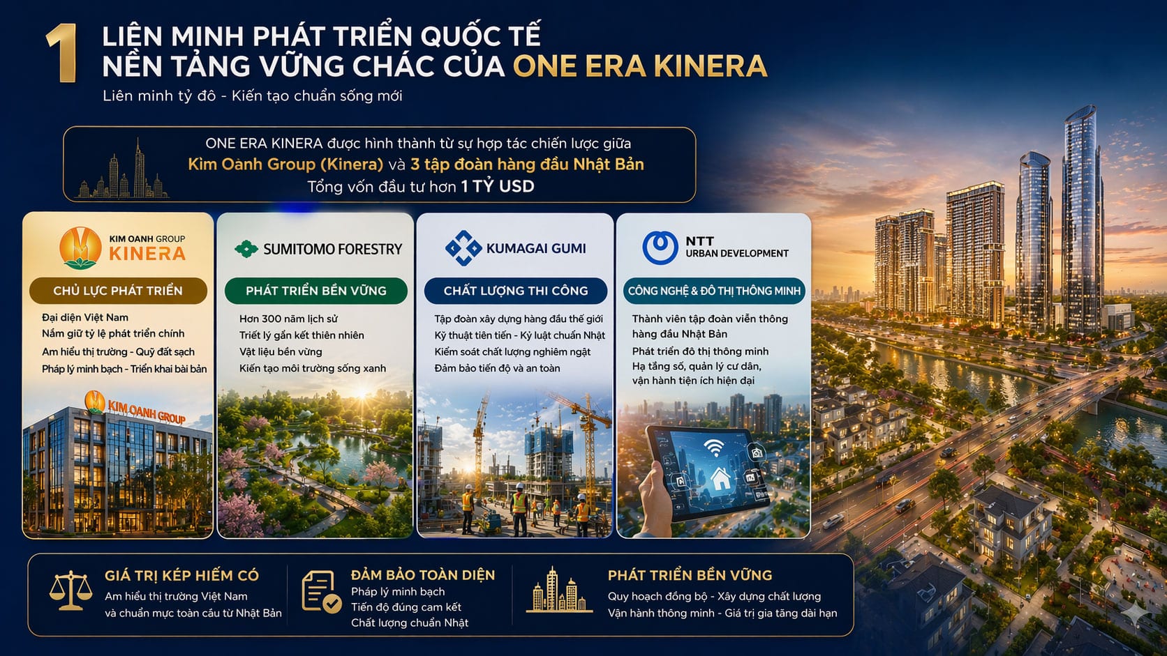 Trong bối cảnh thị trường bất động sản ngày càng đòi hỏi tính minh bạch, năng lực triển khai và tầm nhìn dài hạn, việc lựa chọn đúng chủ đầu tư gần như quyết định 70% thành công của một khoản đầu tư. Và khi nhắc đến ONE ERA, cái tên không thể bỏ qua chính là Kinera – Kim Oanh Group, đơn vị đang đứng sau toàn bộ chiến lược phát triển dự án.